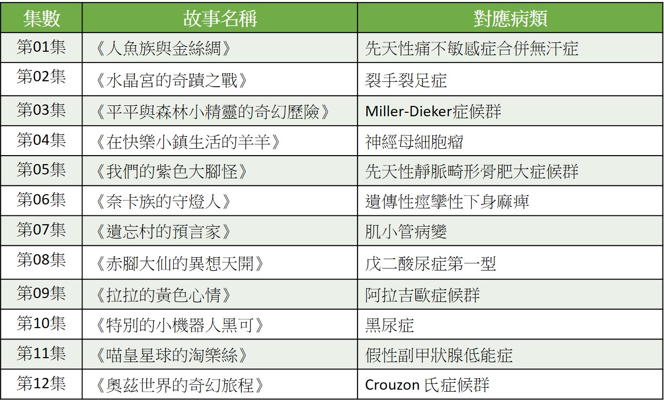 普瑞德-威利氏症候群(小胖威利)、瓦登伯革氏症候群(藍眼珠)、重型海洋性貧血、軟骨發育不全症(小小人兒)、克斯提洛氏彈性蛋白缺陷症(小黑人症)、成骨不全症(玻璃娃娃)、克魯松氏症、遺傳性表皮分解性水皰症(泡泡龍)、遺傳性痙攣性下身麻痺、Alstrom 氏症候群、原發性肺動脈高壓、威爾森氏症、小腦萎縮症、Angelman氏症候群、肌肉萎縮症、馬凡氏症、黏多醣症、結節性硬化症、血小板無力症、瑞特氏症候群、先天性巨大型黑色素痣、性聯遺傳型低磷酸鹽佝僂症、楓糖尿症、龐貝氏症、肢端肥大症、亨丁頓氏舞蹈症。 |