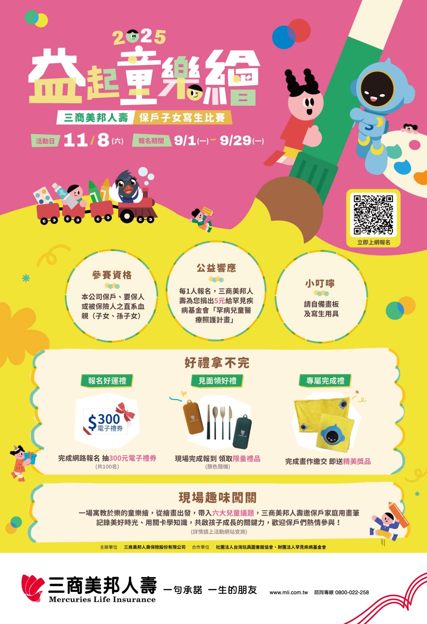 三商美邦人壽2025年舉辦保戶子女寫生比賽,以「益起童樂繪」為主軸,從繪畫出發,開啟一場寓教於樂的童樂繪,歡迎保戶們共襄盛舉~ 只要每一人完成活動報名,三商美邦人壽就會捐5元給予罕見疾病基金會,期盼共 ...