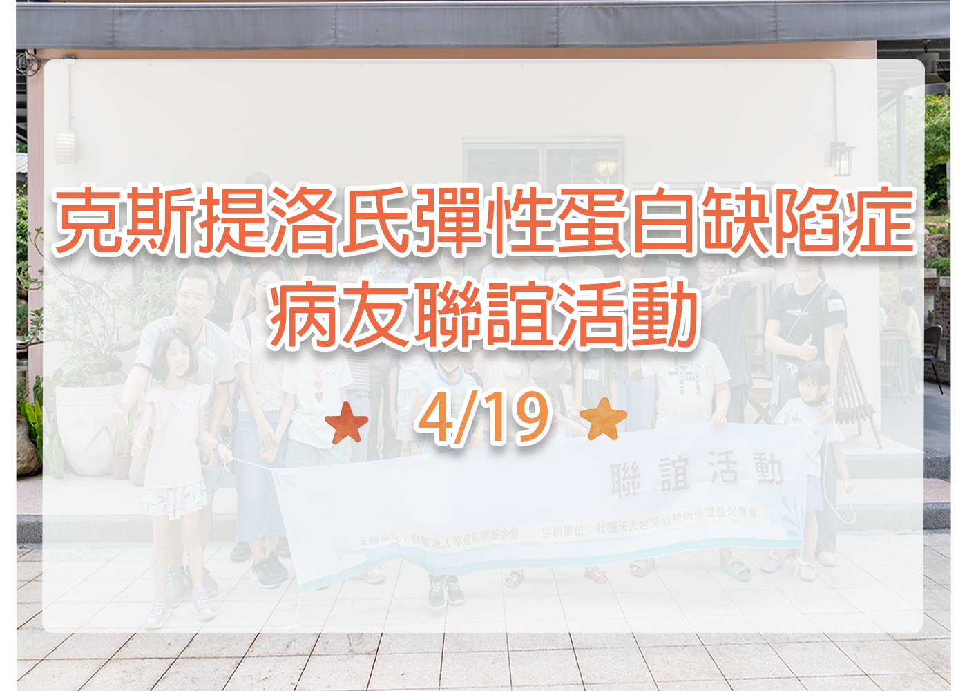 親愛的家屬 您好: 本會長年致力於辦理各病類聯誼活動,期能連結同疾病病友家庭相互認識、支持。此次將於 4月19日(六) 辦理 克斯提洛氏彈性蛋白缺陷症病友聯誼活動 ,誠摯邀請您前來共襄盛舉! 活動日期 ...