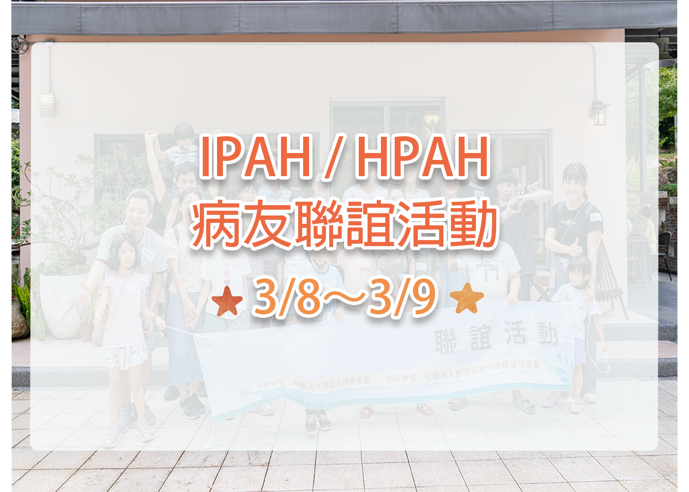 親愛的朋友,您好: 今年本會將於 3月8日(六)至3月9日(日) 舉辦 特發性或遺傳性肺動脈高壓(IPAH/ HPAH)病友聯誼活動 ,邀請您來罕見家園度過休閒愜意的小旅行。 活動安排台大醫院胸腔外科 ...
