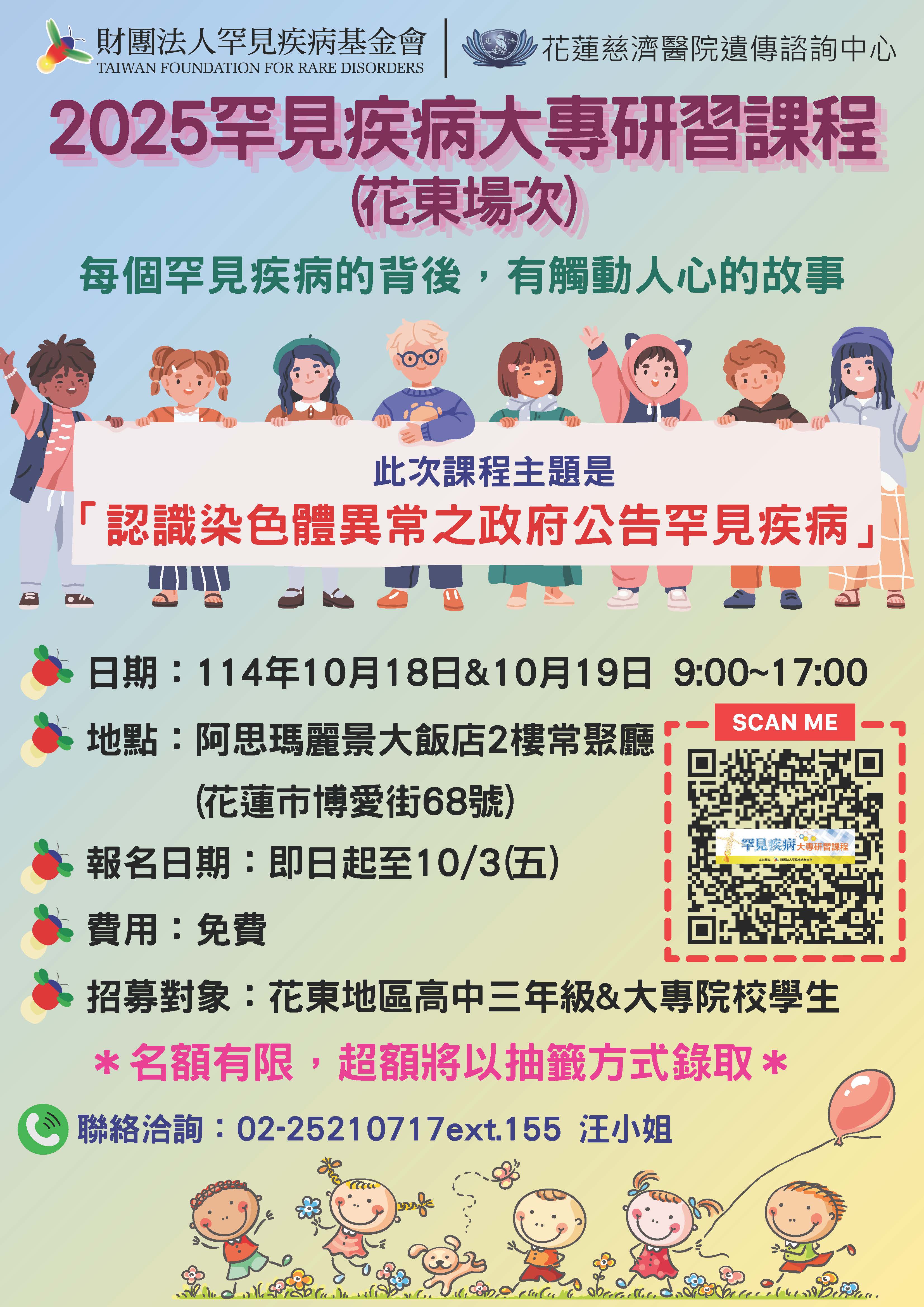 什麼是罕見疾病?罕見疾病又是怎麼發生的?透過罕見疾病大專研習課程,認識罕見疾病,了解基因遺傳的奧秘,探索生命價值,啟發對於罕病相關議題之興趣。 本次活動在眾多罕病中,聚焦在 「認識染色體異常之政府公告 ...