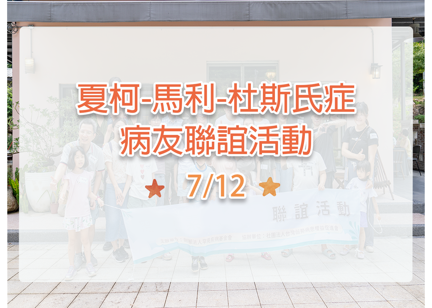 親愛的CMT夥伴們~ 本會與CMT病友會將於7/12(六)於罕見家園辦理聯誼活動,將帶大家體驗罕見家園豐富的活動課程,有地板滾球、體適能課程等,也邀請大家再次相聚交流討論,歡迎您前來參與! ★日期: ...