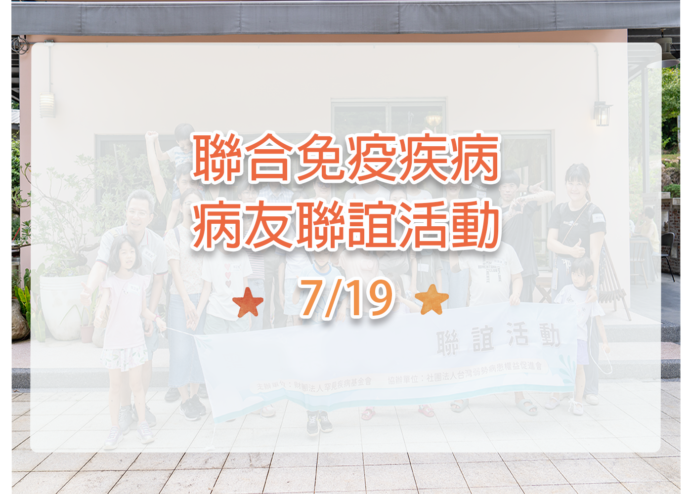 親愛的家屬 您好: 7月19日(六)將於罕病基金會台北總會辦理聯合免疫疾病病友聯誼活動,此次活動邀請到林口長庚醫院兒童過敏氣喘風濕科李文益教授及台大醫院小兒遺傳科簡穎秀主任介紹疾病及醫療新知,更安排病 ...