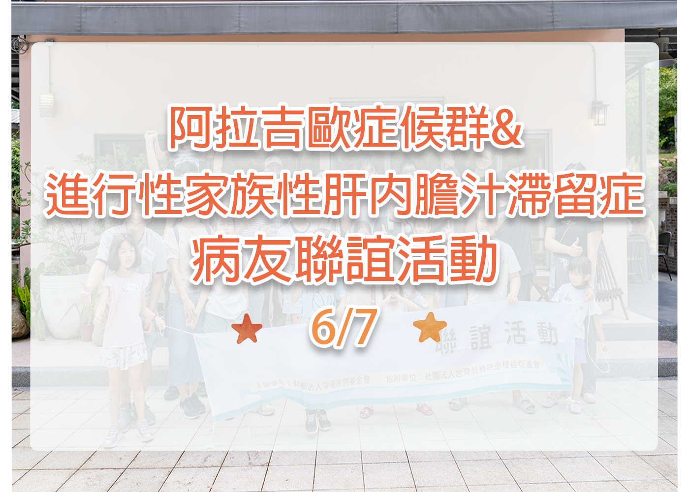 親愛的家屬 您好: 本會6月7日(六)將於國立臺灣科教館辦理 「阿拉吉歐症候群」及「進行性家族性肝內膽汁滯留症」病友聯誼活動,此次活動邀請到台大醫院小兒消化科陳慧玲醫師介紹目前疾病治療方式,更安排病友 ...