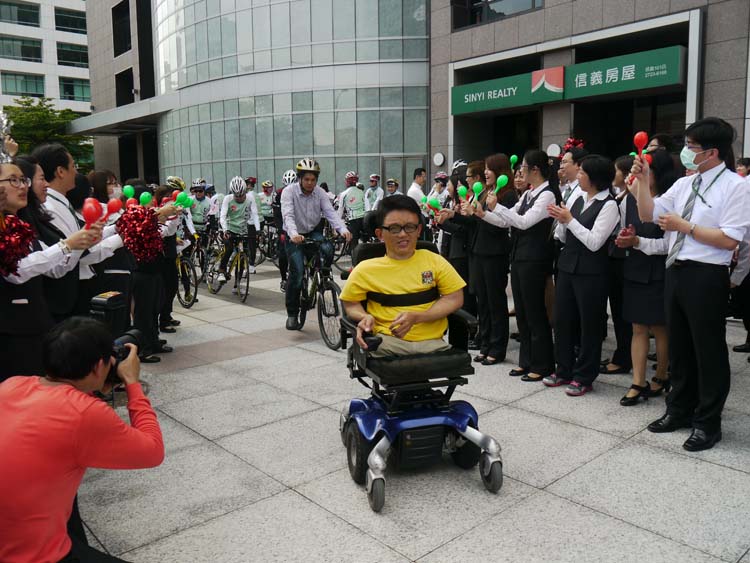 At the ceremony site on May 14, Zhou Jun-ji, the chairman of Sinyi Realty cheered all partners up. And Mr. Yang, Deputy Executive Director of TFRD, led two rare disease patients there to root for the team. One of the patients, Duncan, he suffered a constant fracture because he has been diagnosed with “McCune Albright Syndrome”. He has always looking forward to be ride around Taiwan in an electric wheelchair. Due to his health condition, it’s barely possible to fulfill his dream. Therefore, by taking this opportunity, Duncan specifically requested to accompany everyone to ride for a while with an electric wheel to complete his dream.