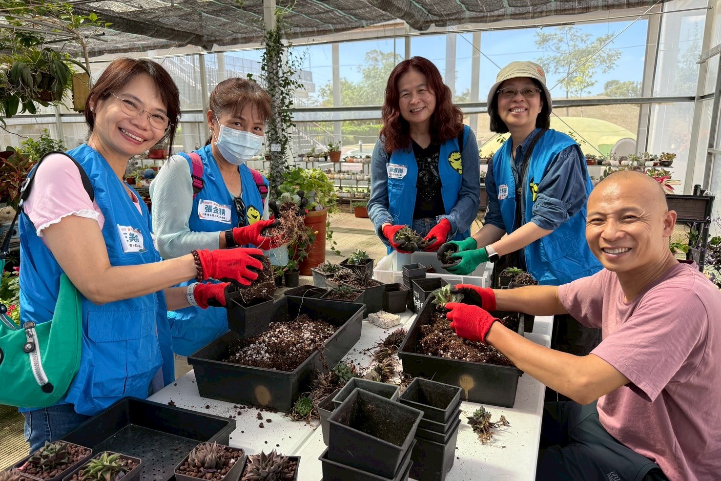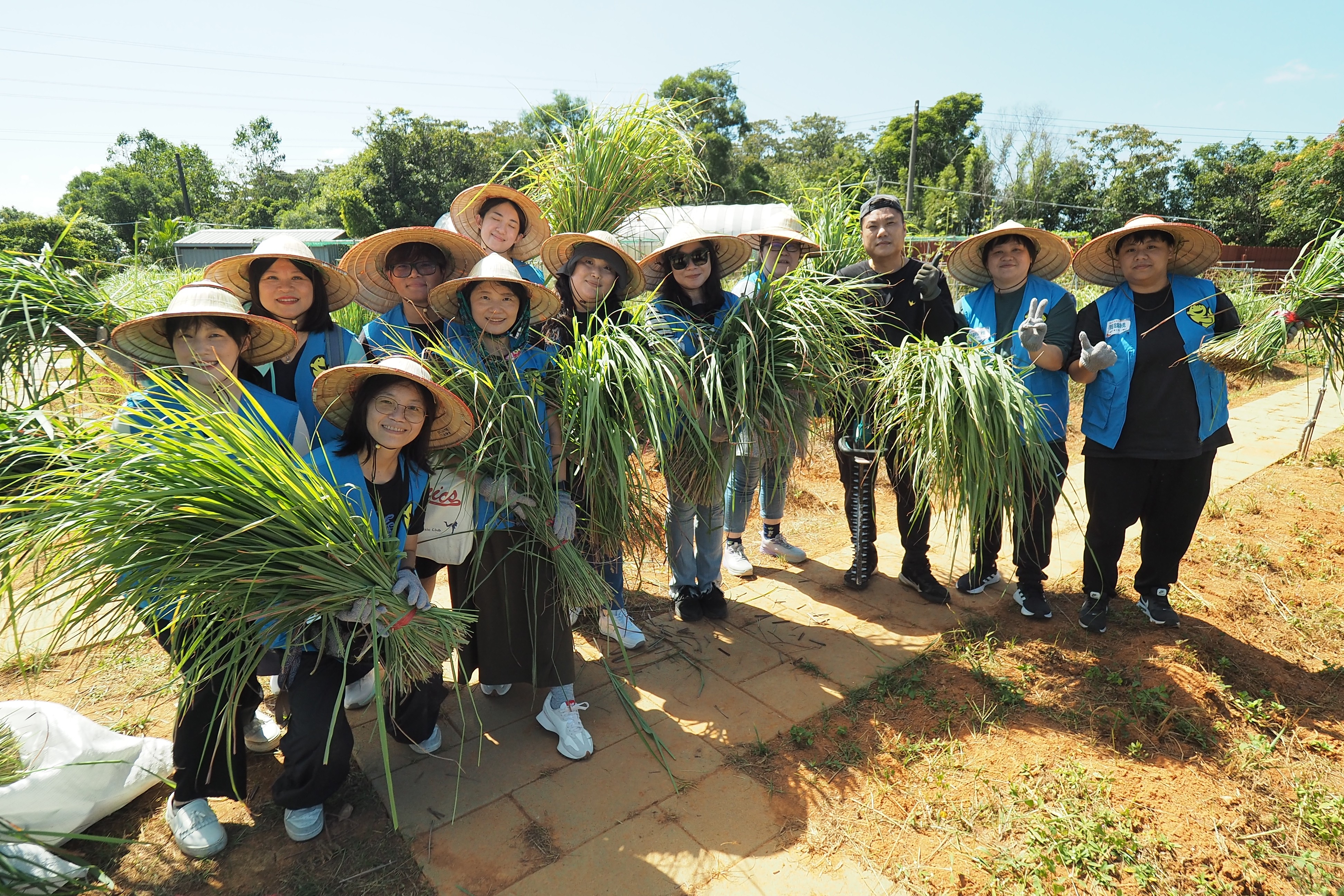 活動在家園導覽下揭開序幕,從基金會的成立、罕病家庭的需求,到罕見園區建置理念,深入了解罕見疾病病友在教育、照護、生活支持上的日常挑戰。除了基因教育中心的病友生活認識外,透過實際互動,志工們不僅看見病友的堅韌與純真,也更體會「支持」是一種持續而細膩的力量。上午的農藝與園務服務也是此次活動的重要亮點之一。頂著豔陽,志工們揮汗分工協助檸檬香茅採收、園區雜草整理與施肥。汗水淋漓的過程中,大家彼此鼓勵,每一份投入都讓家園更加整潔、舒適,也象徵富邦人壽志工以行動支持罕病家庭的真心。