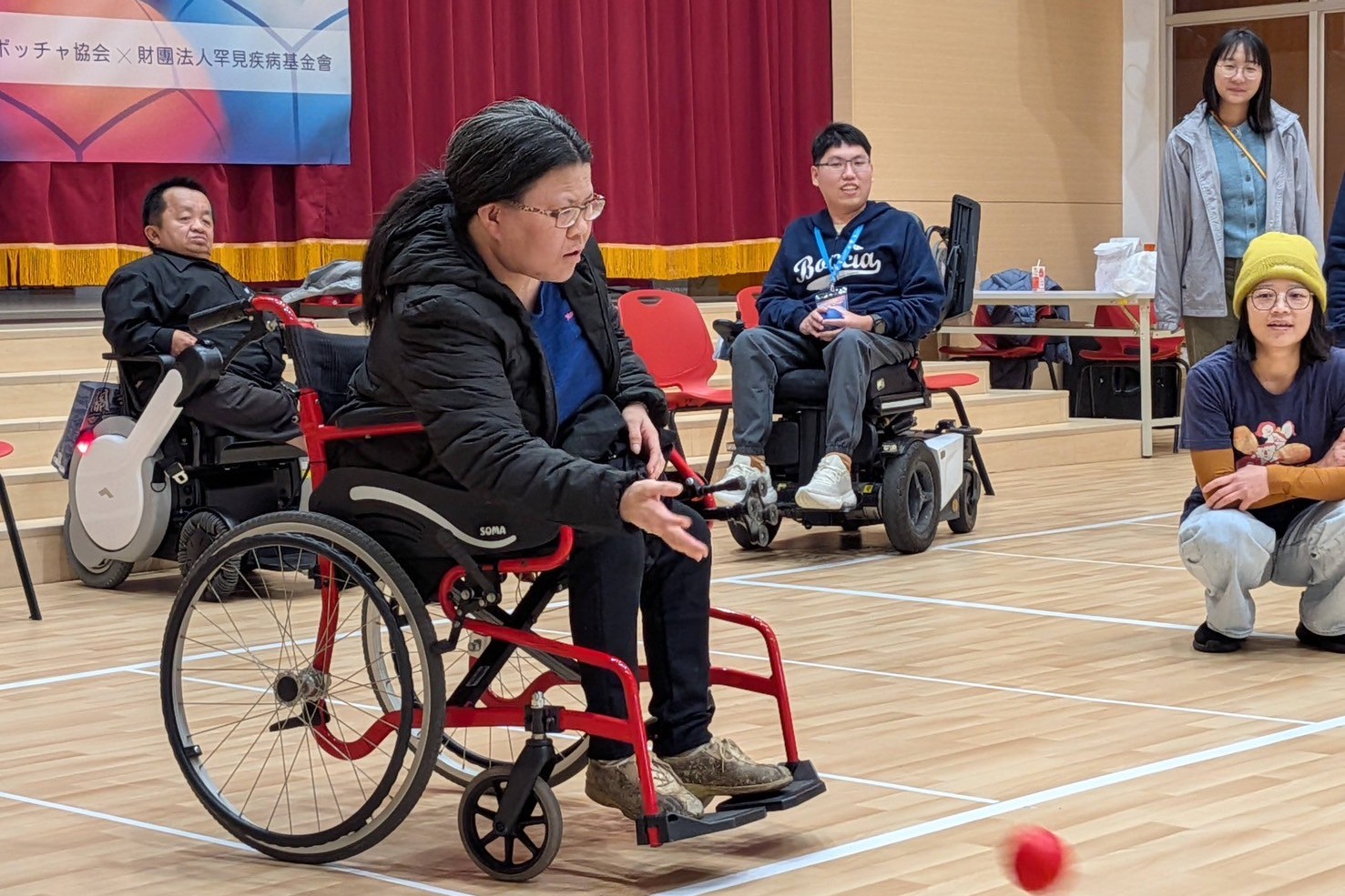 另外,日本愛媛地板滾球協會、台灣地板滾球運動聯盟與基金會於今年1月份攜手展開跨國交流活動。此次日本愛媛地板滾球協會特別帶領三位選手來台參訪罕見家園,並邀請龍潭啟智教養院組隊前來參與比賽切磋,同時號召家園「悠活團體課程」的輪椅病友一同體驗地板滾球。許多夥伴是第一次接觸這項運動,親身嘗試後紛紛表示地板滾球不僅規則簡單,更是非常適合輪椅使用者參與的運動項目,讓大家在歡笑中感受競技的樂趣與成就感。晚上則安排罕見職人帶領調酒體驗活動,透過手作與互動交流,為一天的行程增添輕鬆溫馨的氛圍。日本選手除進行友誼交流外,也實際體驗園區內的無障礙設施與沐浴設備,對完善貼心的規劃感到新奇與感動。